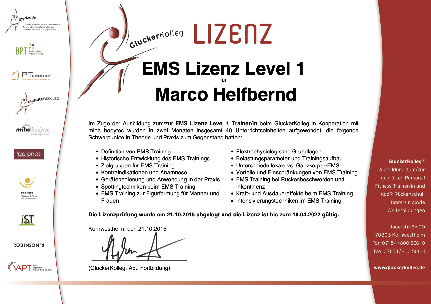 2015 festigte ich mein Wissen zu EMS mit einer Lizenz zum EMS-Trainer und EMS-Master Trainer.